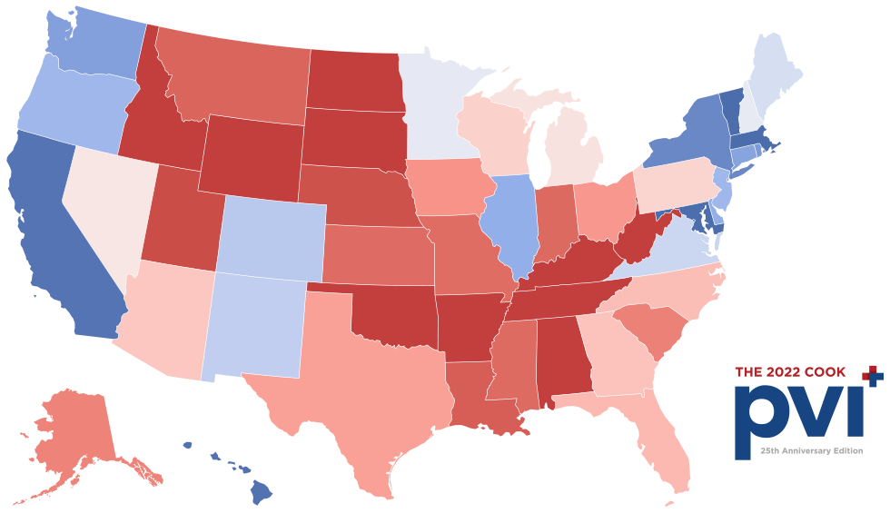 'Party' column classifies each state as 'Democratic' or 'Republican' based on a political science measurement called the Cook Partisan Voter Index.