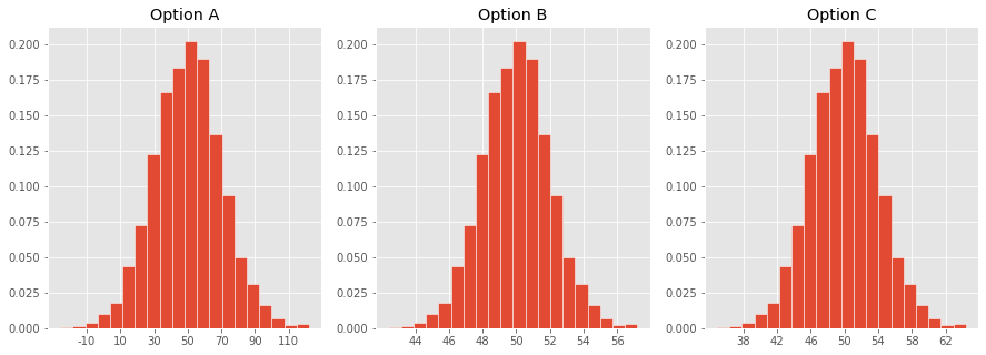 Which one of these histograms corresponds to the distribution of the sample mean for samples of size 100 drawn from a population with mean 50 and SD 20?