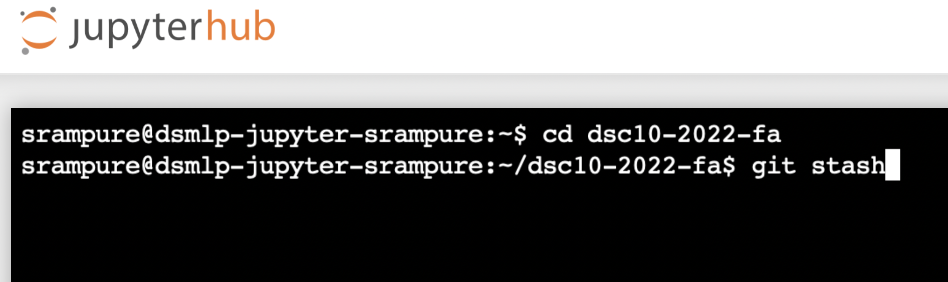 git stash, at which point your terminal window should look like the one below. Then, hit enter to run the command. You should see some output.