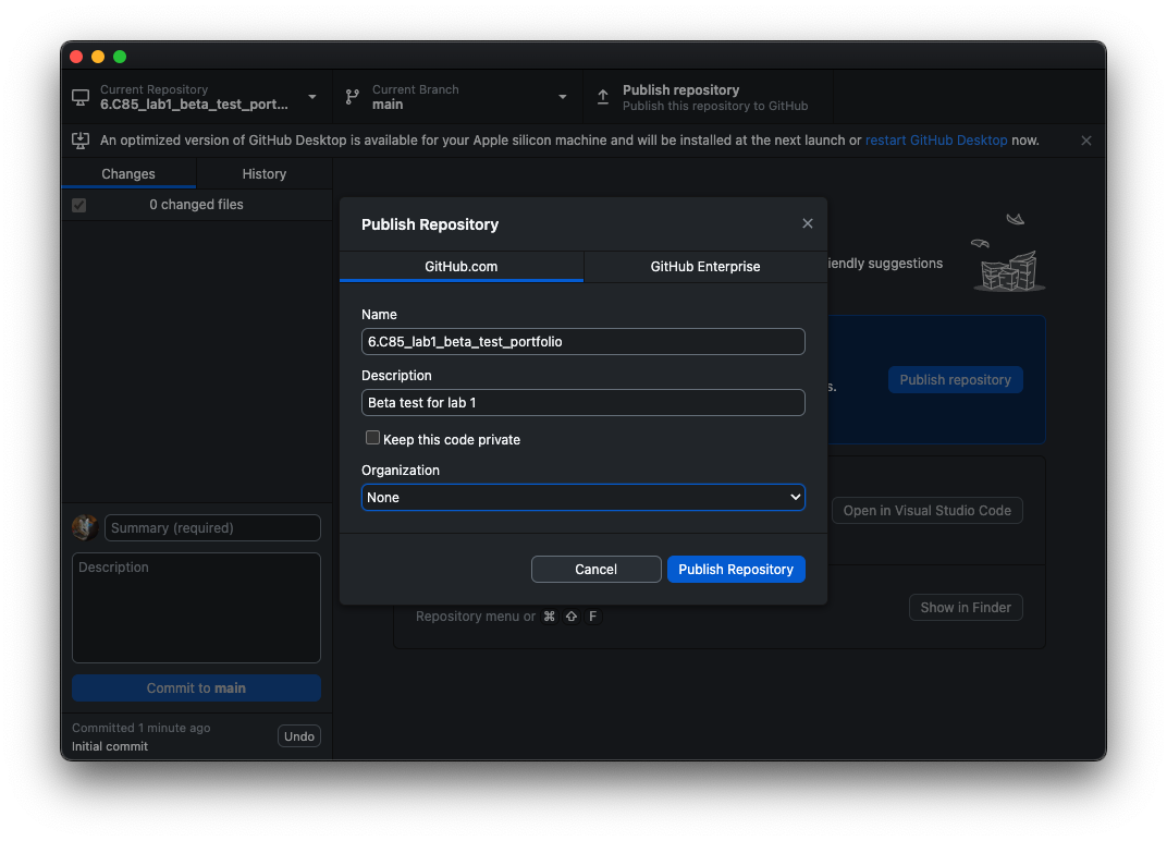 portfolio(or anything else you want, but the rest will assumeportfolio) - Publish it on GitHub (verify that it worked by visiting