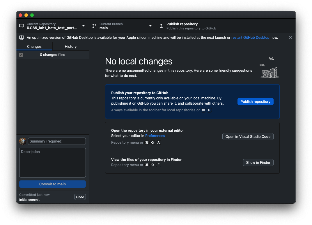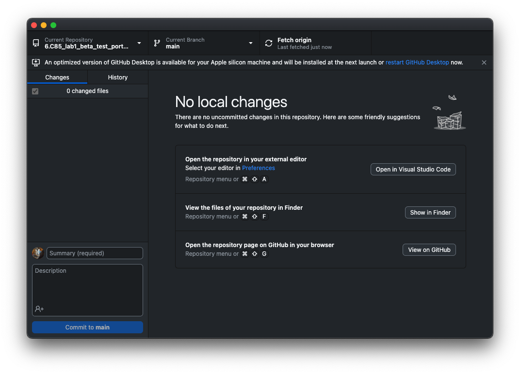 https://github.com/YOUR_USERNAME/portfolioor clicking Repository > View on GitHub in GitHub Desktop’s menu) - Open it on Visual Studio Code (Menu: Repository > Open in Visual Studio Code)