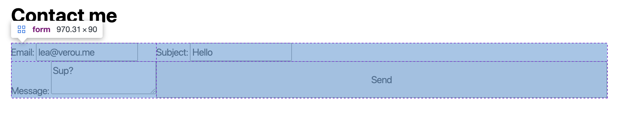 The quick and dirty way would be to apply display: contents to the <label> elements, so that stop creating boxes of their own, and their children are placed directly in the grid. But the proper way to do it is to use subgrid. The core idea is that we make the labels grid containers themselves (display: grid), but their grid is a subset of the form grid (grid-template-columns: subgrid). The last piece of the puzzle, is that we need to make the labels (and the submit button while we’re at it) to span a whole row. We can use that by grid-column: 1 / -1; which means that the element will start at the first column and end at the last (-1) column.