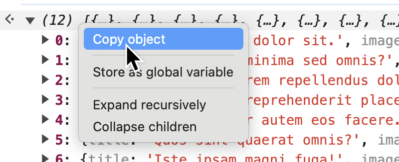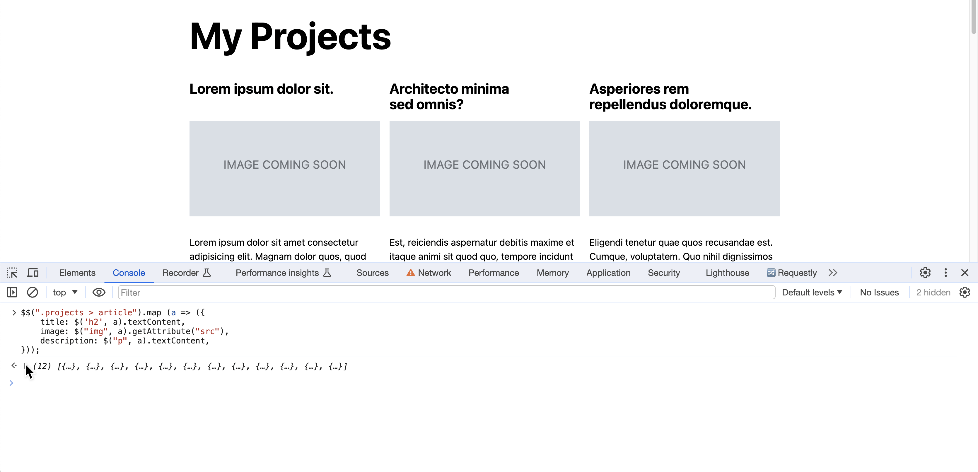We will use the browser console to extract the data from our HTML to JSON so that if you have edited your HTML to contain your actual projects, you don’t lose your data. The following code assumes you have used the same structure for your projects as what was given in the previous labs, where the list of projects was within a <div class="projects> and each project looked like this: