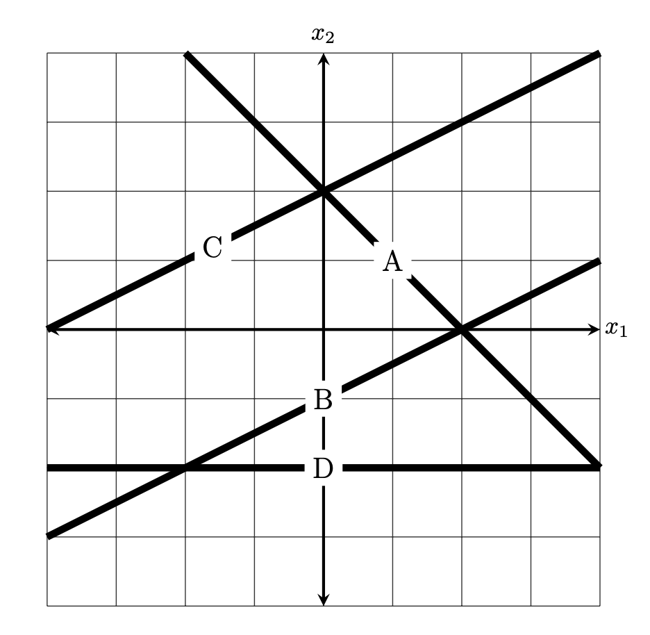 Considering option \(B\), it looks like the point \((0, -1)^T\) is on the boundary, Computing the value of \(H\) here, we get \(H(\vec x) = \vec w \cdot\operatorname{Aug}(\vec x) = (2, -1, 2) \cdot(1, -1, 1) = 0\). That's a good sign, but it's not sufficient to say that this must be the decision boundary (at this point, all we can say is that whatever the decision boundary is, it must go through \((0, -1)\).) To make sure, we pick a second point on the boundary, say, \((2, 0)^T\). Computing \(H\) at this point, we get \(H(\vec x) = \vec w \cdot\operatorname{Aug}(\vec x) = (2, -1, 2) \cdot(1, 2, 0) = 0\). With this, we can conclude that \(B\) must be the decision boundary.