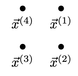 Since \(H = 0\) at \(\nvec{x}{2}\), the decision boundary must pass through that point. And since \(H(\nvec{x}{1}) = 4 = -H(\nvec{x}{3})\), the points \(\nvec{x}{1}\) and \(\nvec{x}{3}\) are equidistant from the decision boundary. Therefore, the decision boundary must pass exactly halfway between \(\nvec{x}{1}\) and \(\nvec{x}{3}\). This makes a line going through \(\nvec{x}{4}\), meaning that \(\nvec{x}{4}\) is on the decision boundary, so \(H(\nvec{x}{4}) = 0\).
