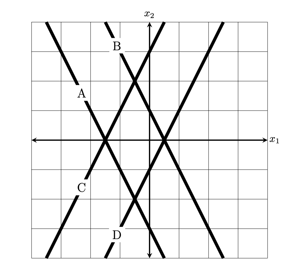 Method 4: reasoning about the slope in each coordinate. Similar to Method 2, we can rule out options \(A\) and \(D\) by reasoning about the slope of the decision boundary in each coordinate.