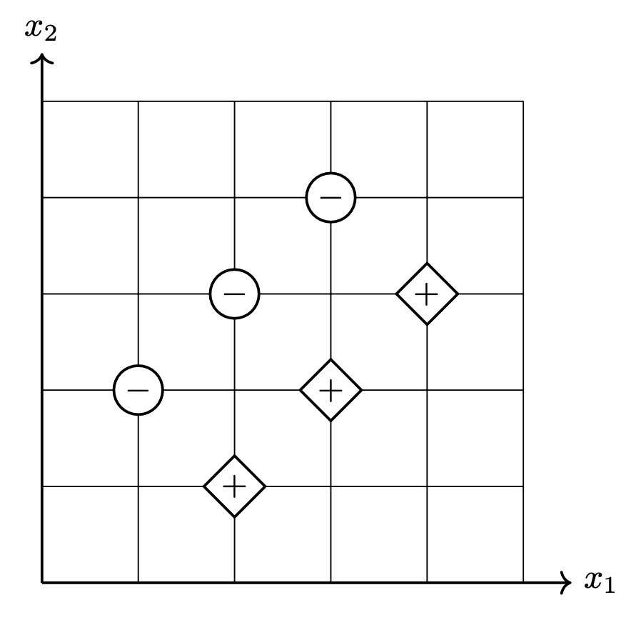 Consider the binary classification data set shown below consisting of six points in \(\mathbb R^2\). Each point has an associated label of either +1 or -1.