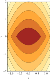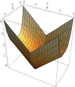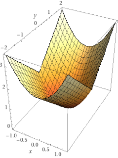 Consider the function \(f(x,y) = x^2 + |y|\). Plots of this function's surface and contours are shown below.