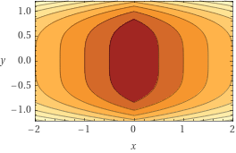 Consider the function \(f(x,y) = |x| + y^4\). Plots of this function's surface and contours are shown below.